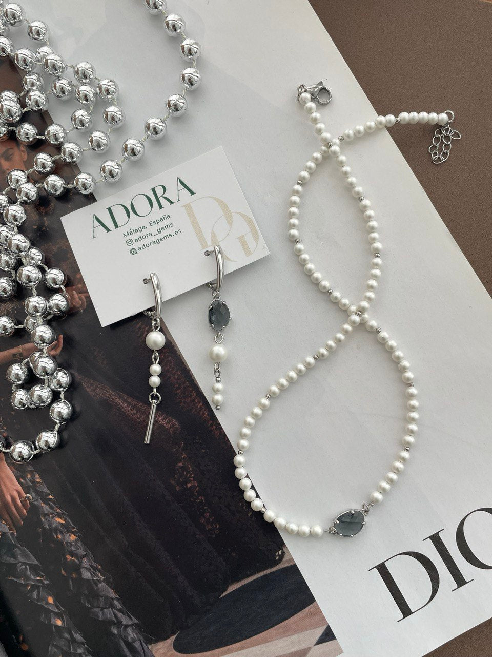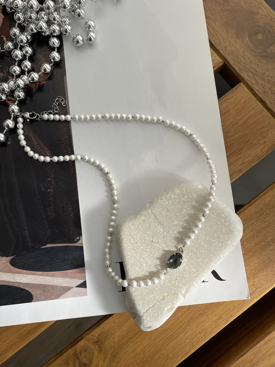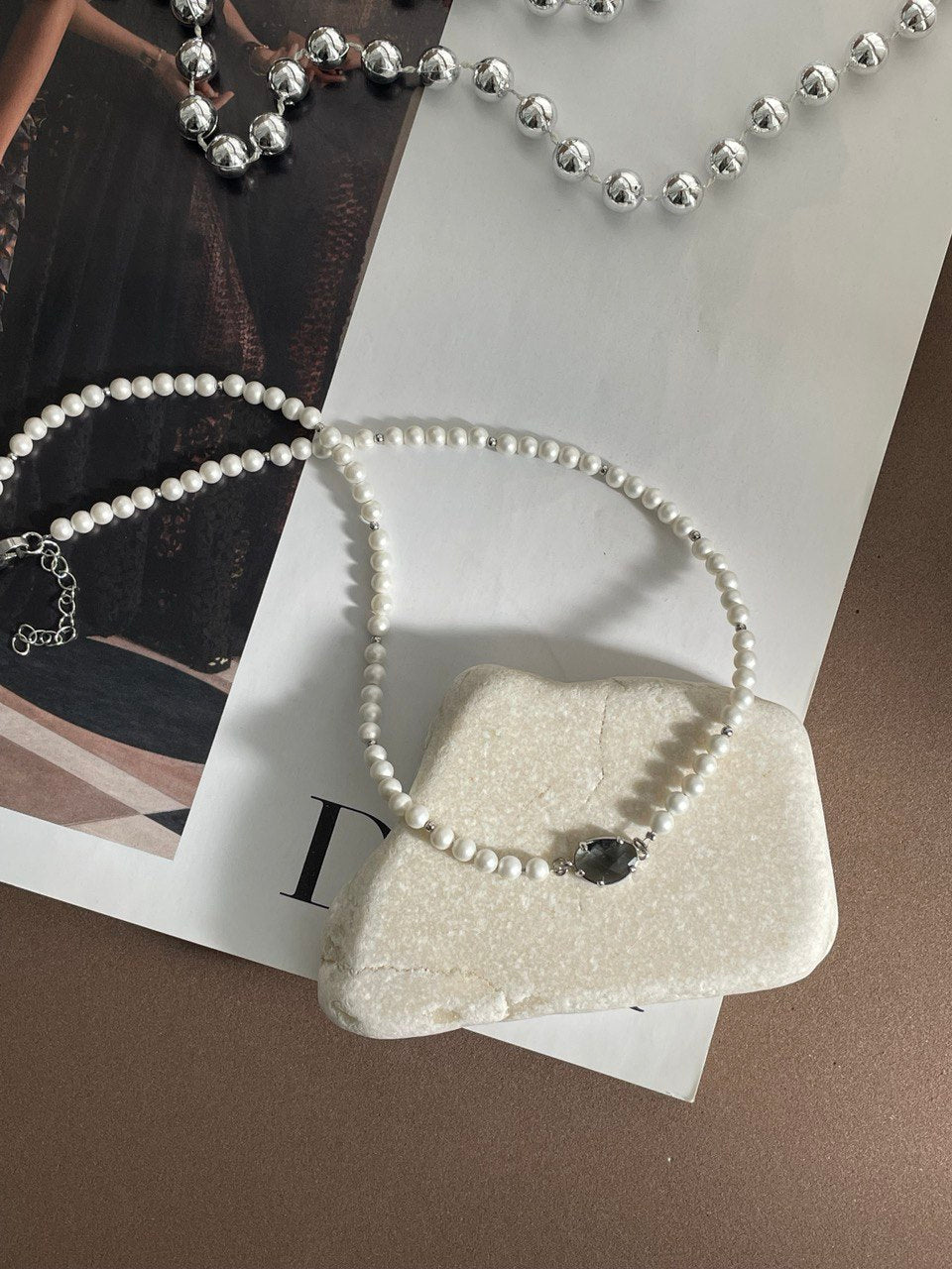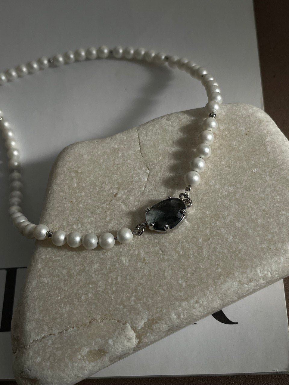 Тонкое колье из матового жемчуга Shell Pearl с кристаллом в центре.