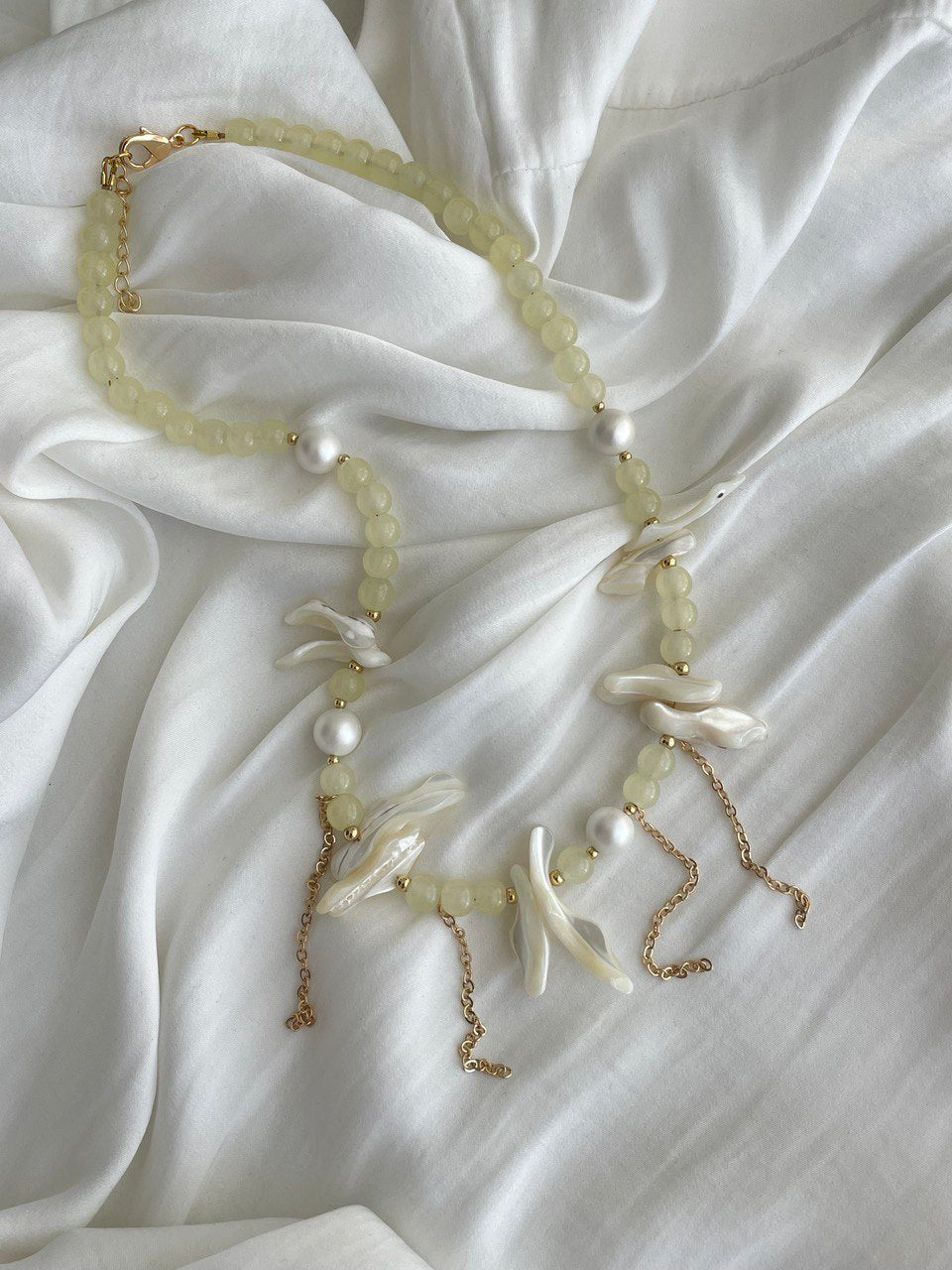 Necklace made of glass in a light yellow shade with inserts of natural mother-of-pearl of an unusual shape and Shell Pearl pearls.