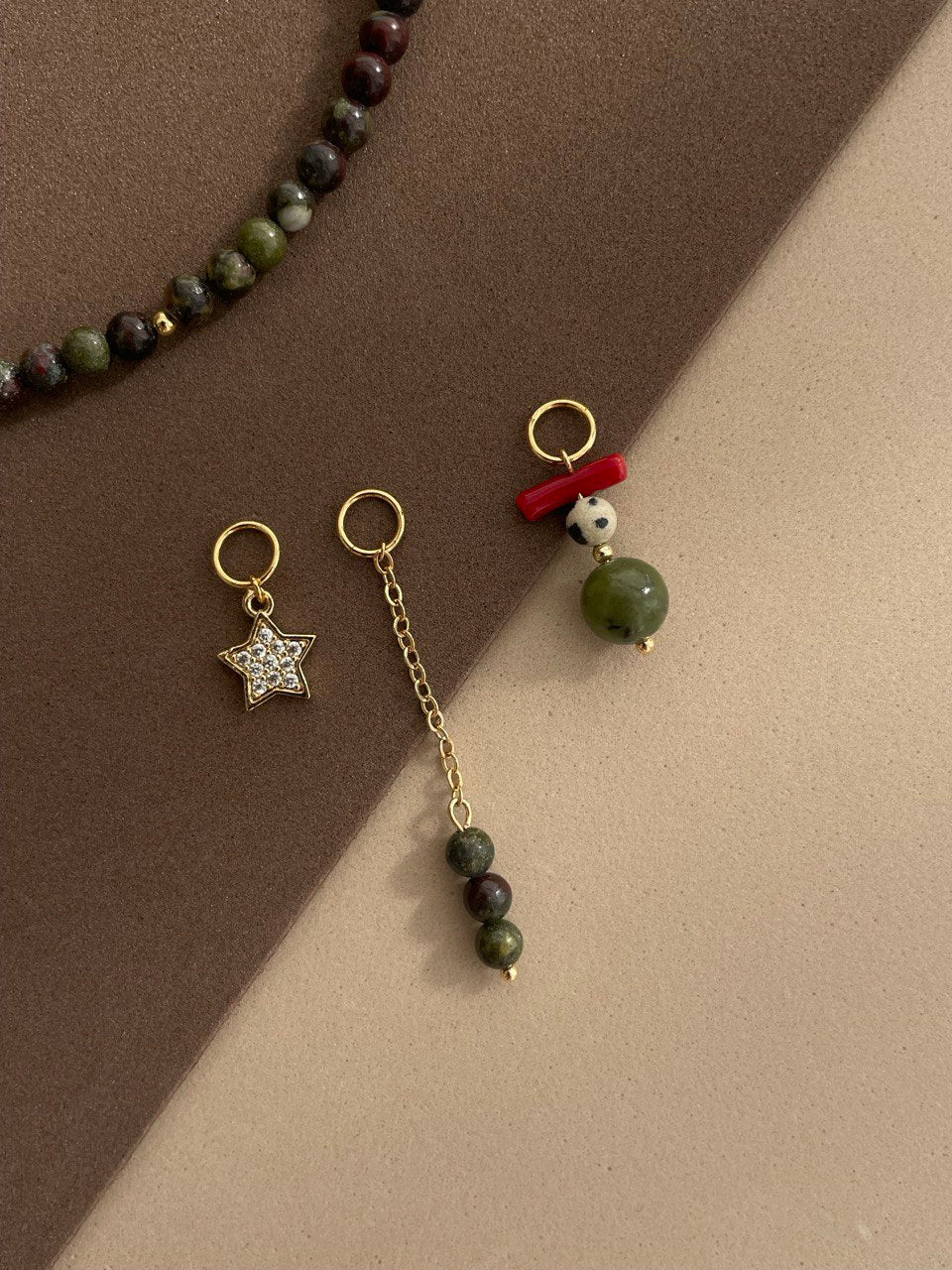 Набор подвесок из натуральных камней: яшма, коралл, жадеит. Их можно надевать на цепочку, тонкий чокер или серьги - кольца. Ручная работа.