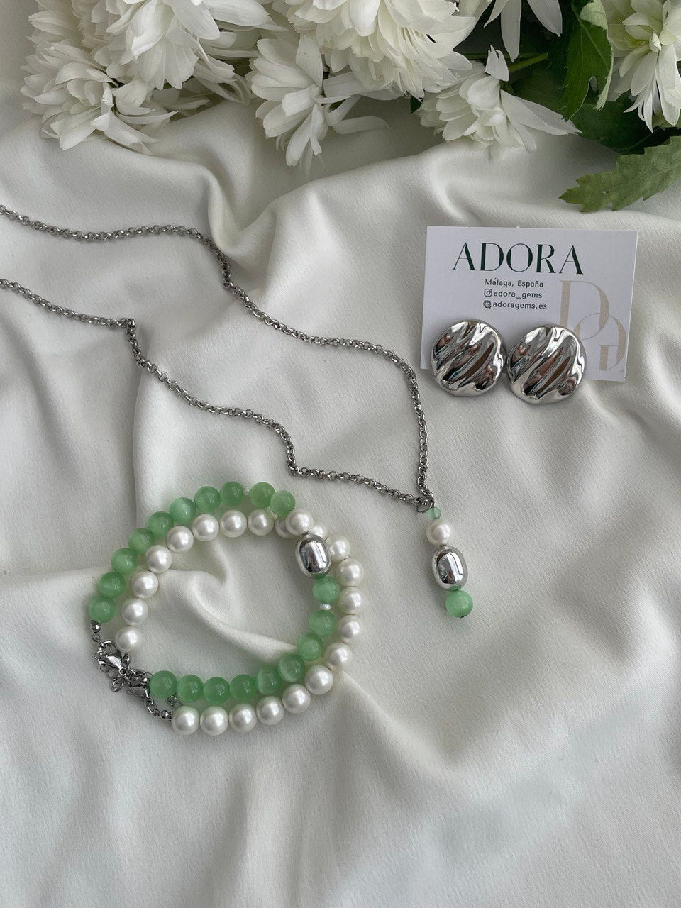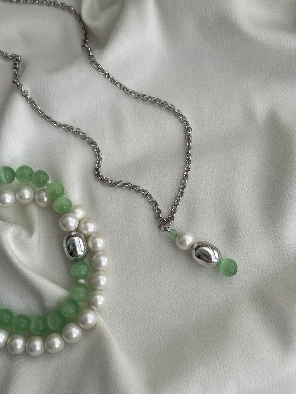 Тонкая цепочка из стали с подвеской из жемчуга Майорка и бусин "кошачьего глаза". Длина цепочки 55 см + 4 см удлинительная цепочка.