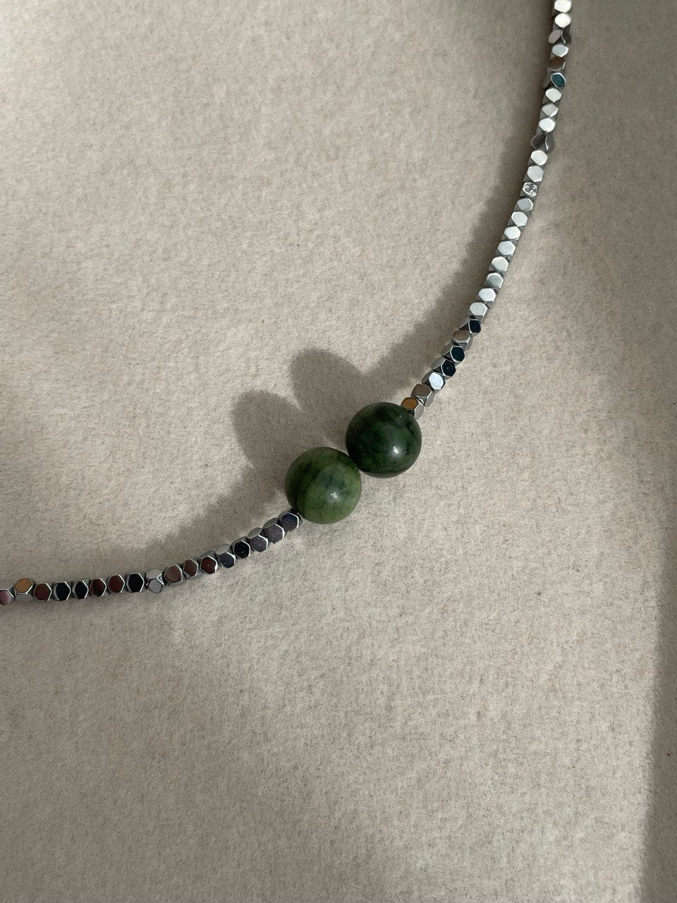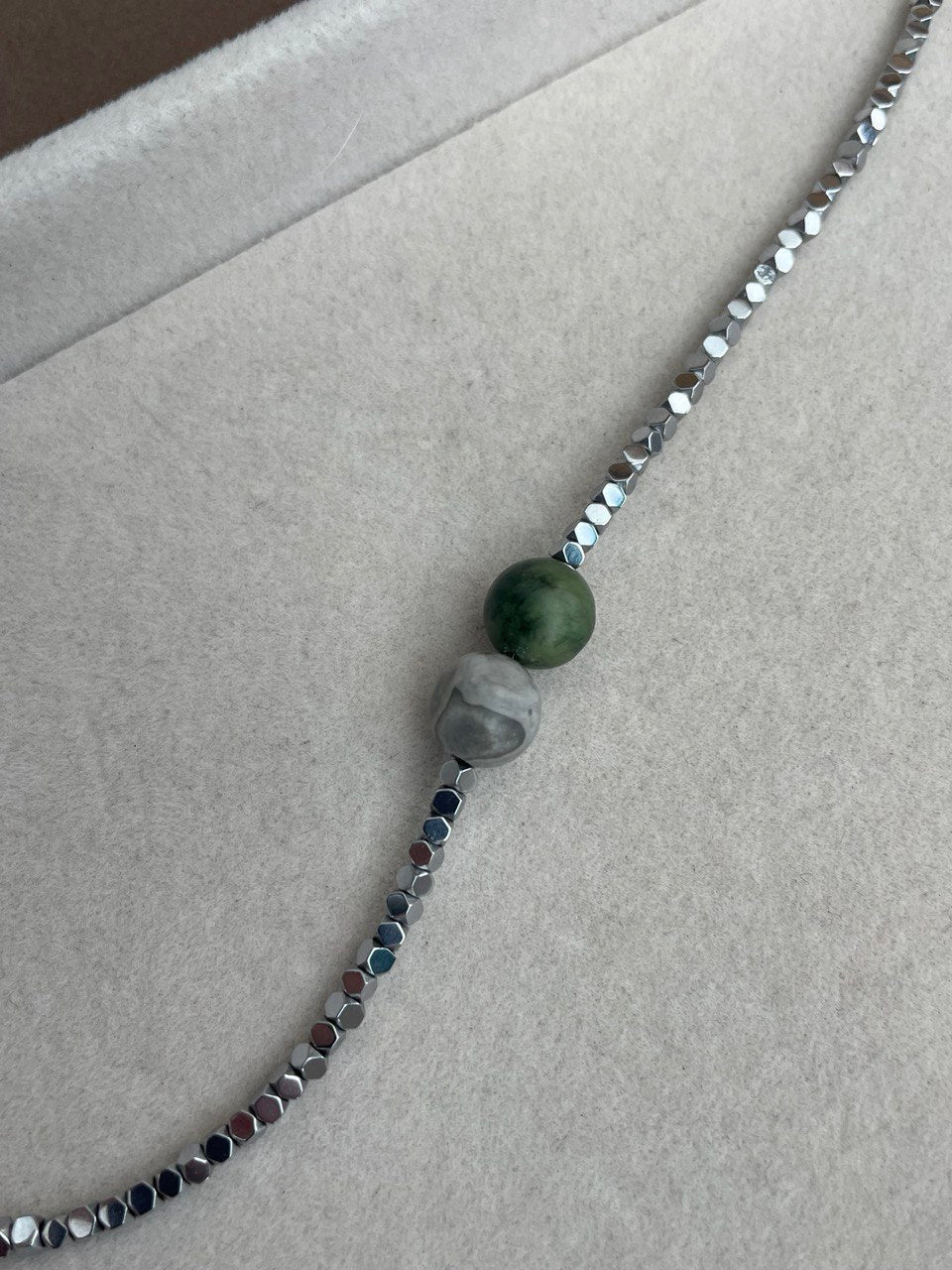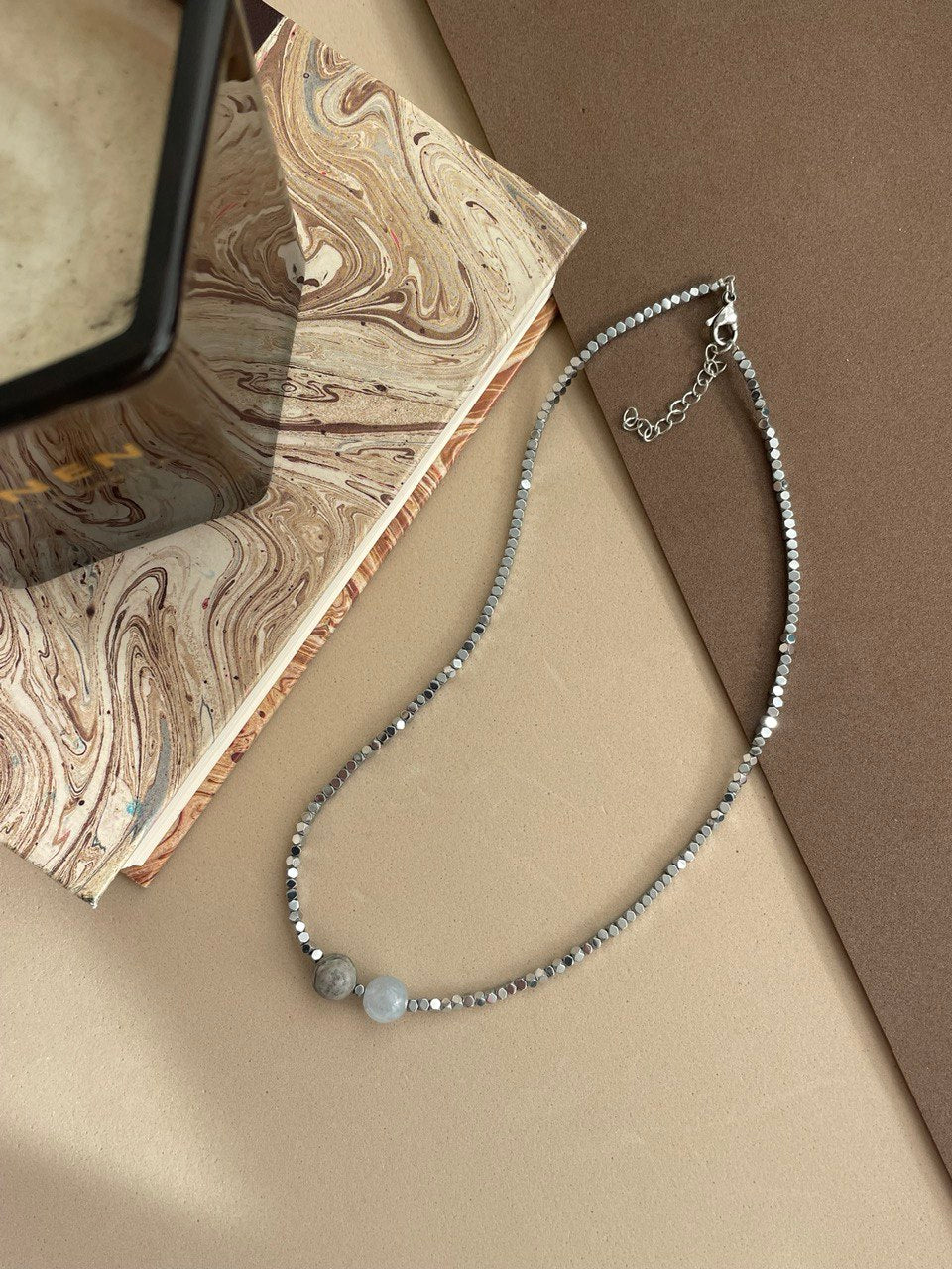 Колье собрано вручную из серебристых бусин гематита. Две центральные бусины вы можете выбрать под нужный вам цвет глаз.