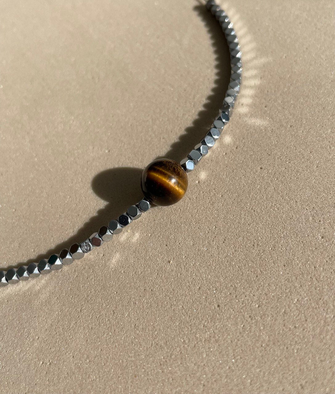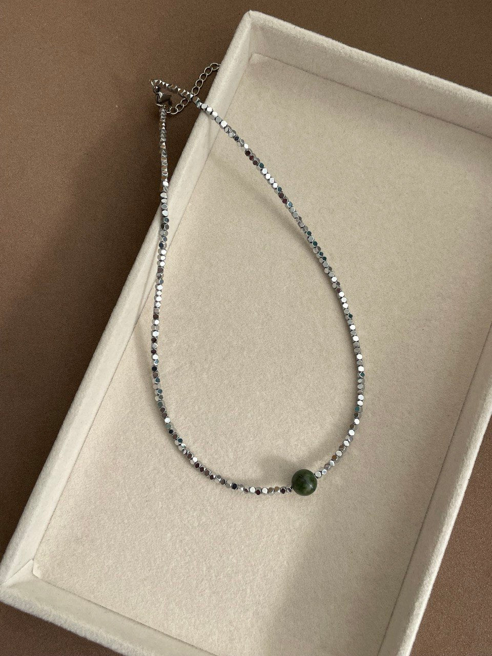 Колье собрано вручную из серебристых бусин гематита. Центральную бусину (одну) вы можете выбрать под нужный вам цвет глаз.