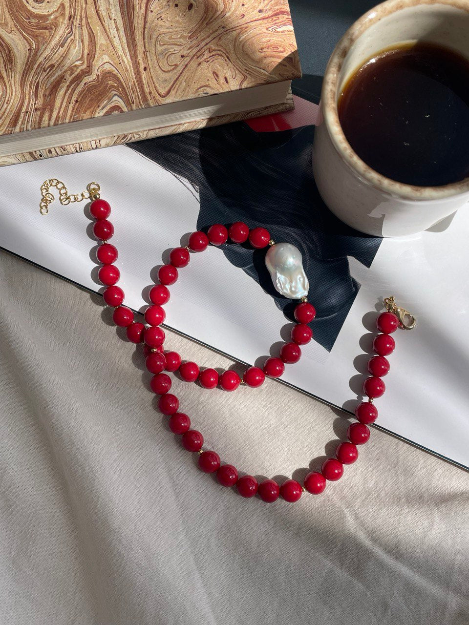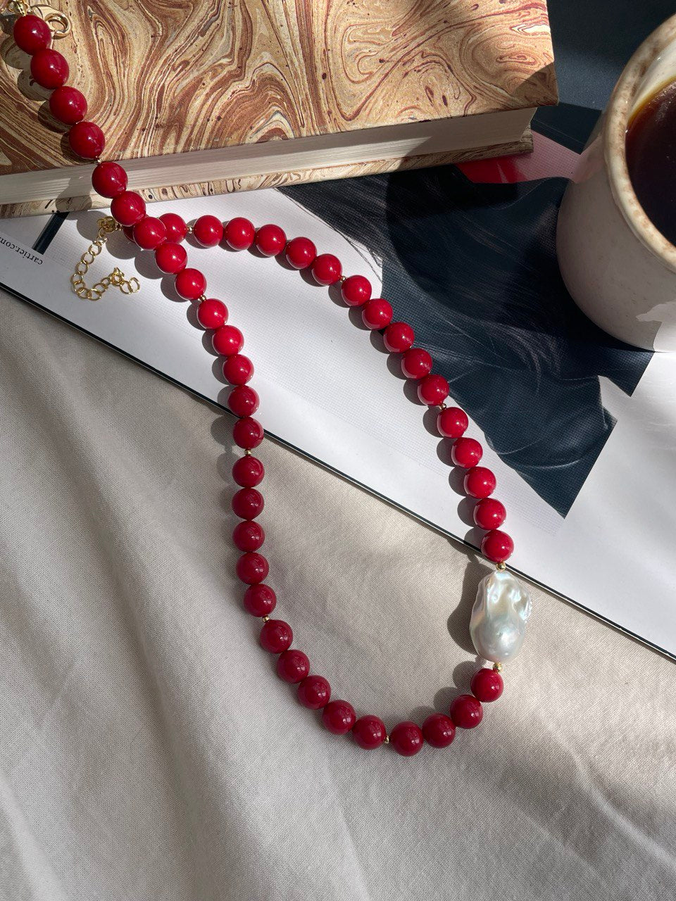 Колье из хрустального жемчуга красного цвета с натуральной барочной жемчужиной. Ручная работа.