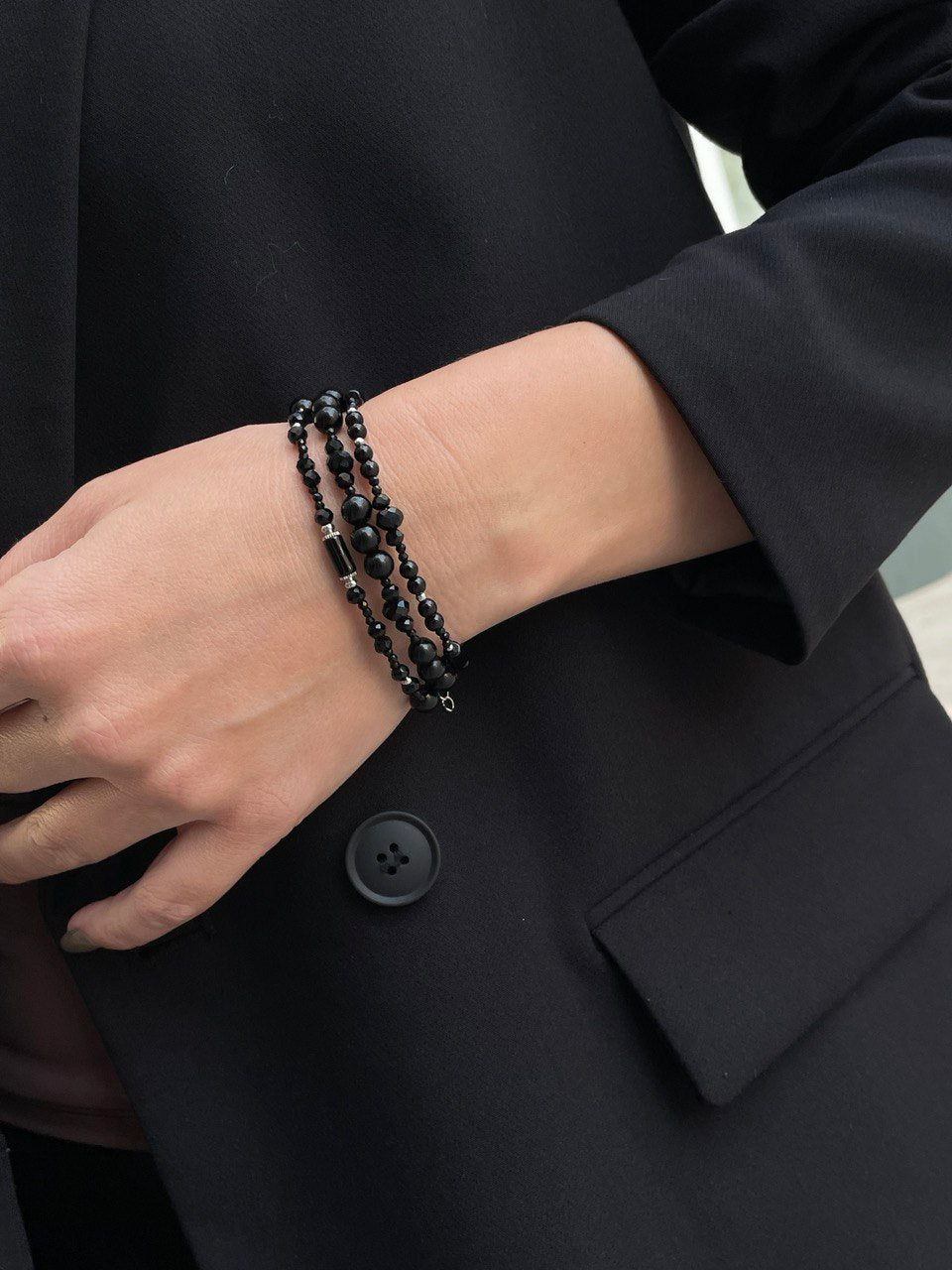 Трехрядный браслет из агата, обсидиана и шпинели. Ручная работа.