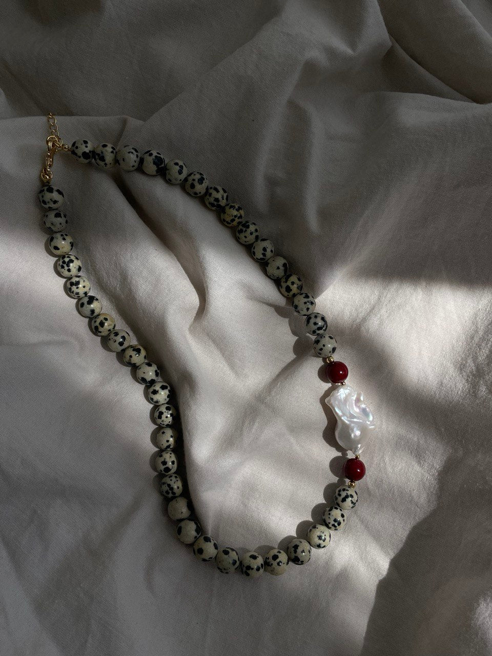 Колье из яшмы с крупной барочной жемчужиной и хрустальным жемчугом.