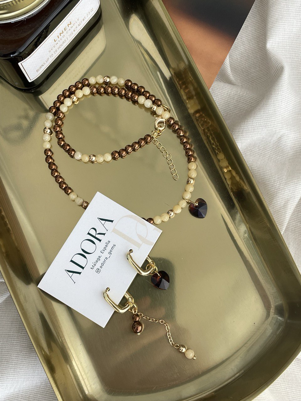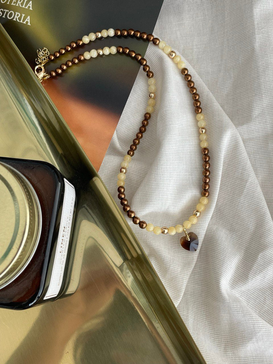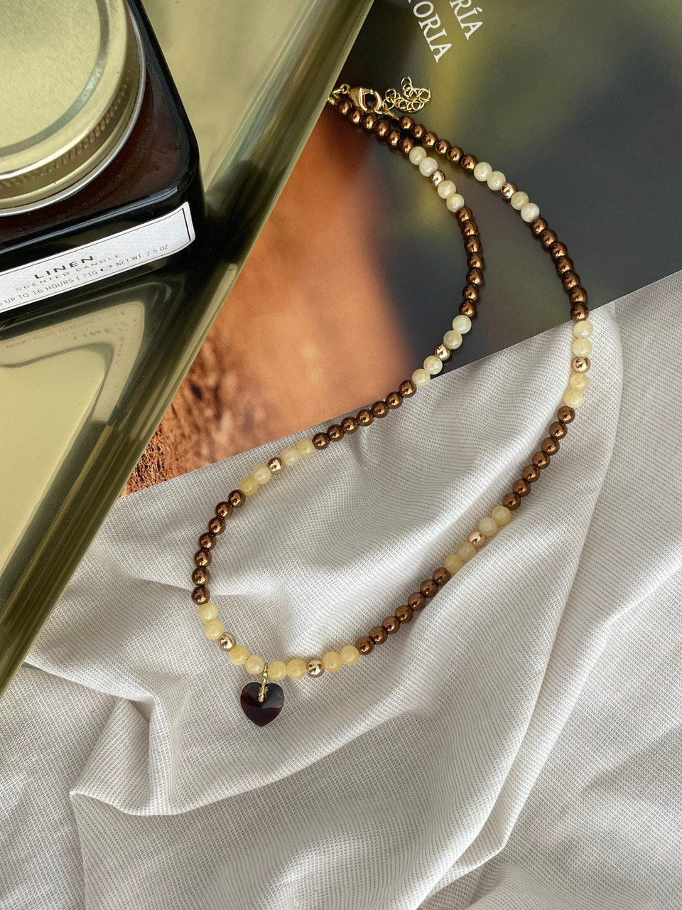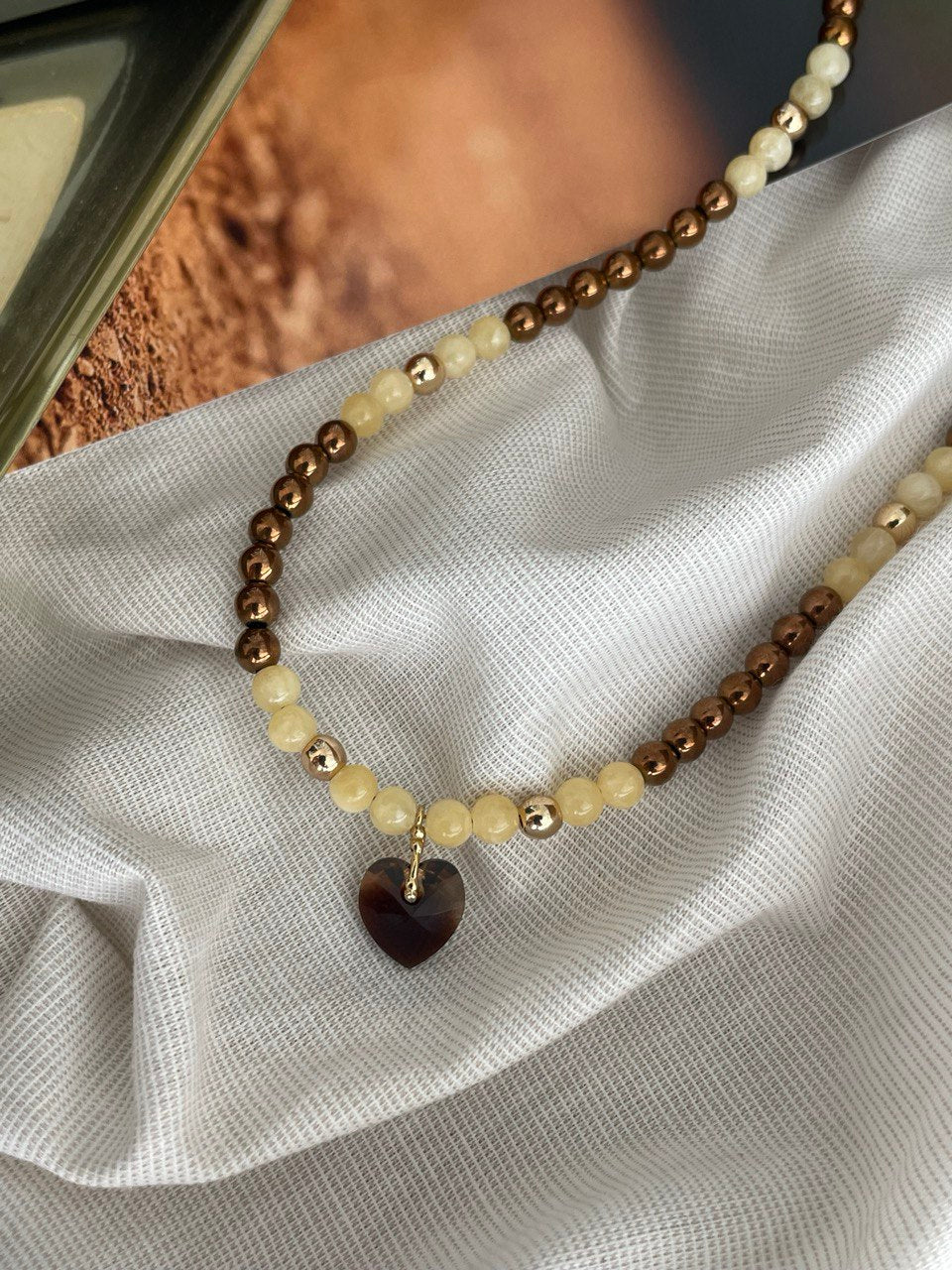 Колье из гематита и кальцита с подвеской из кристалла в форме сердце. Ручная работа.