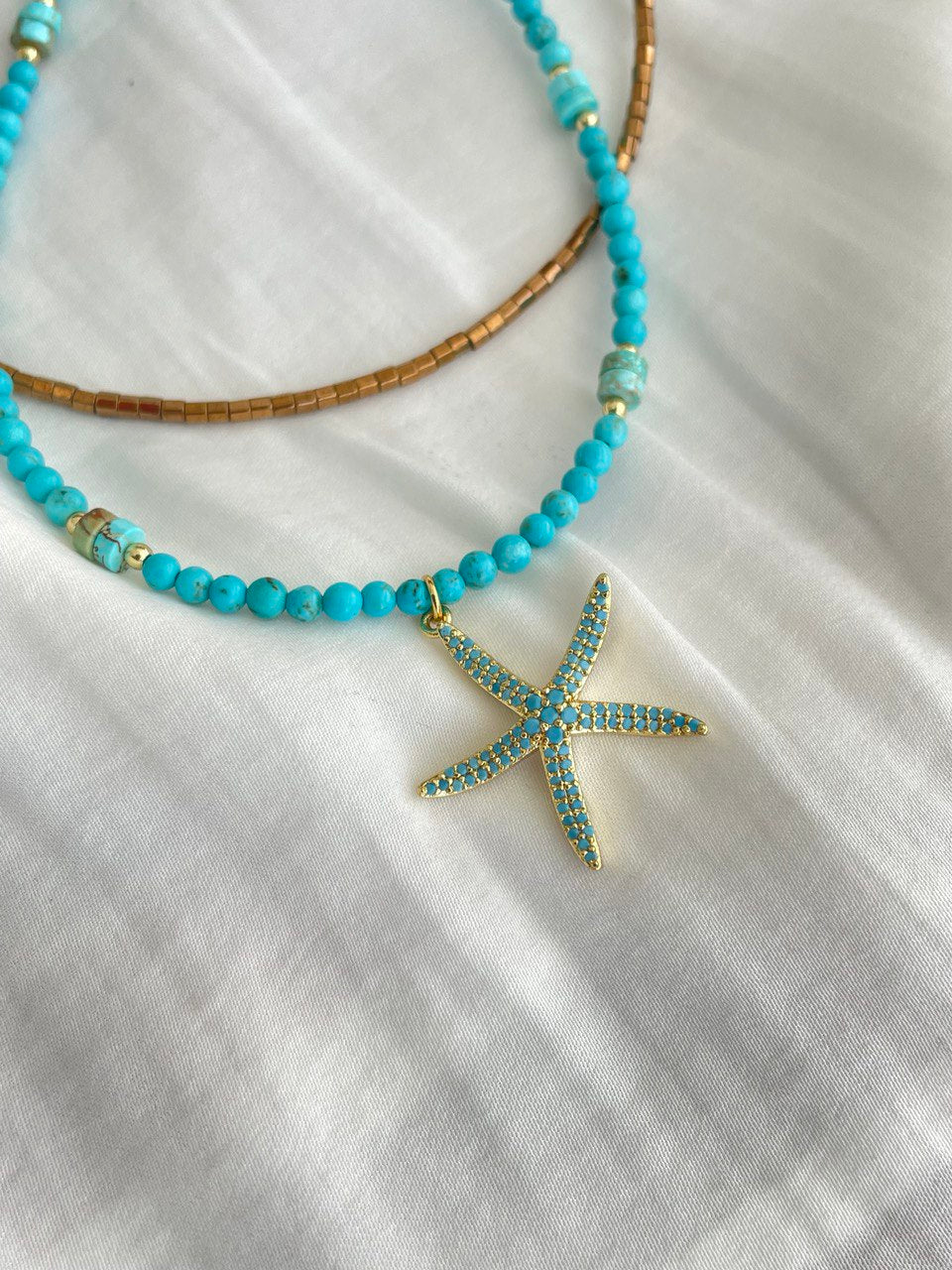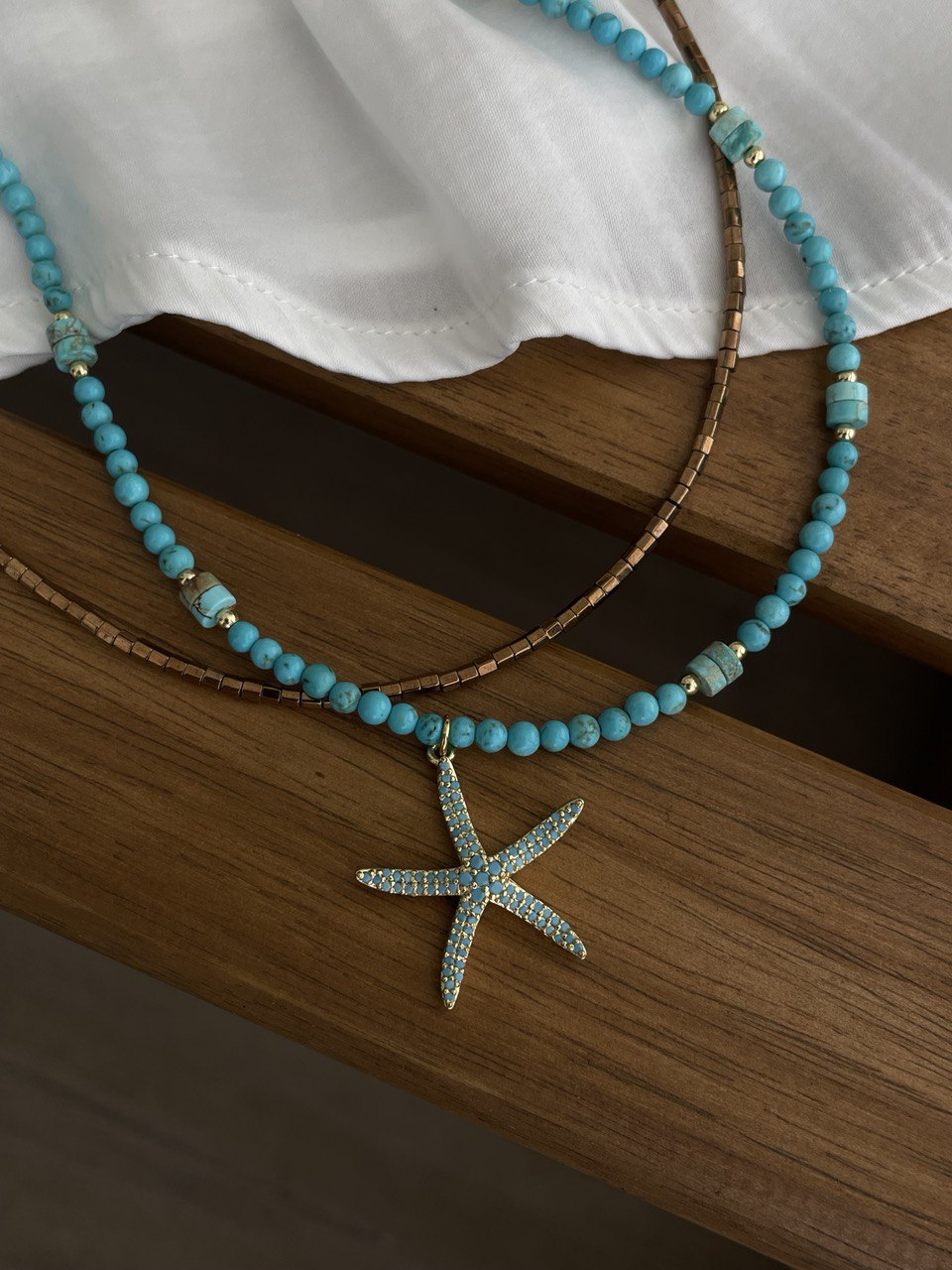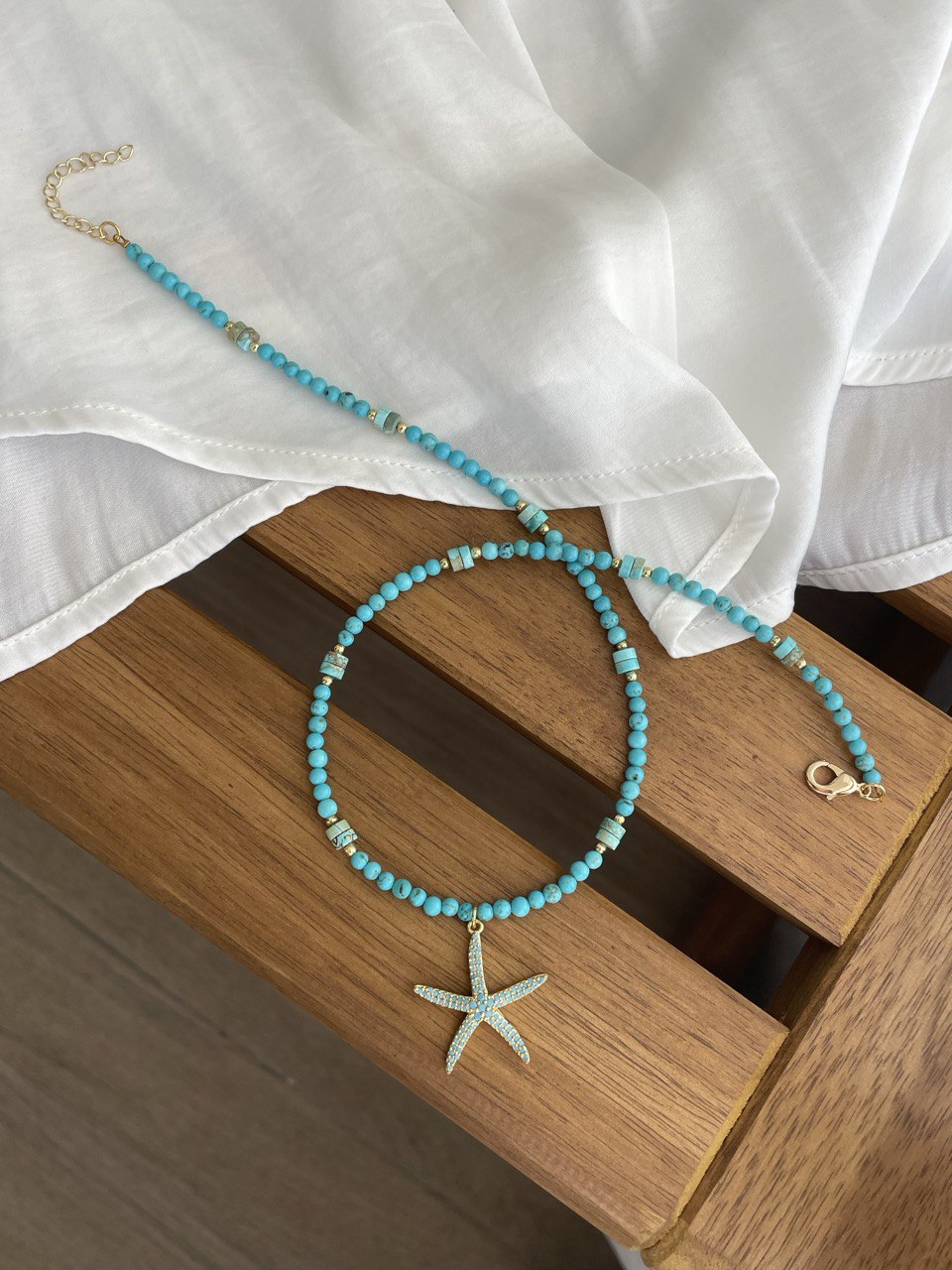 Колье из бирюзы и голубого говлита с подвеской в форме морской звезды.