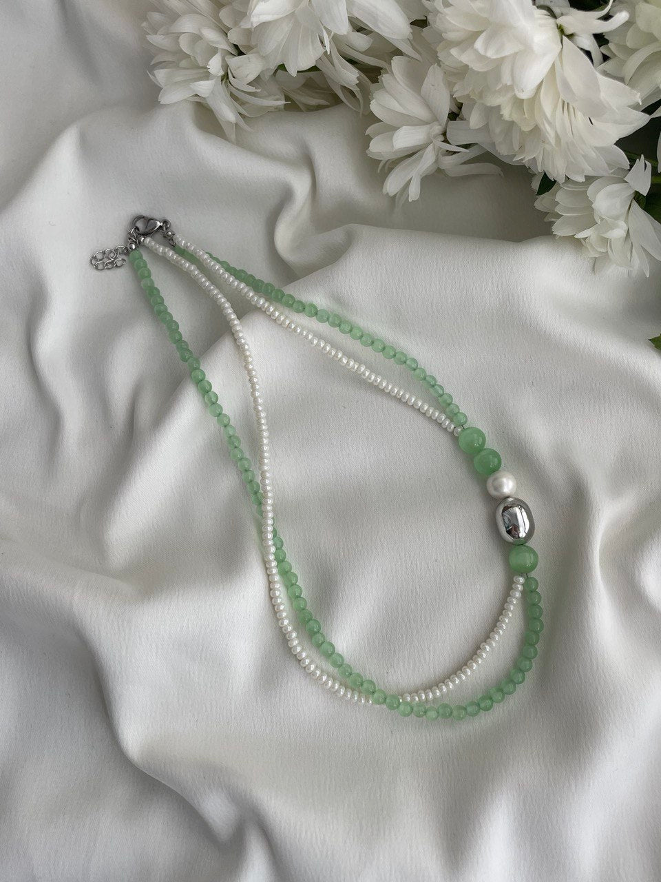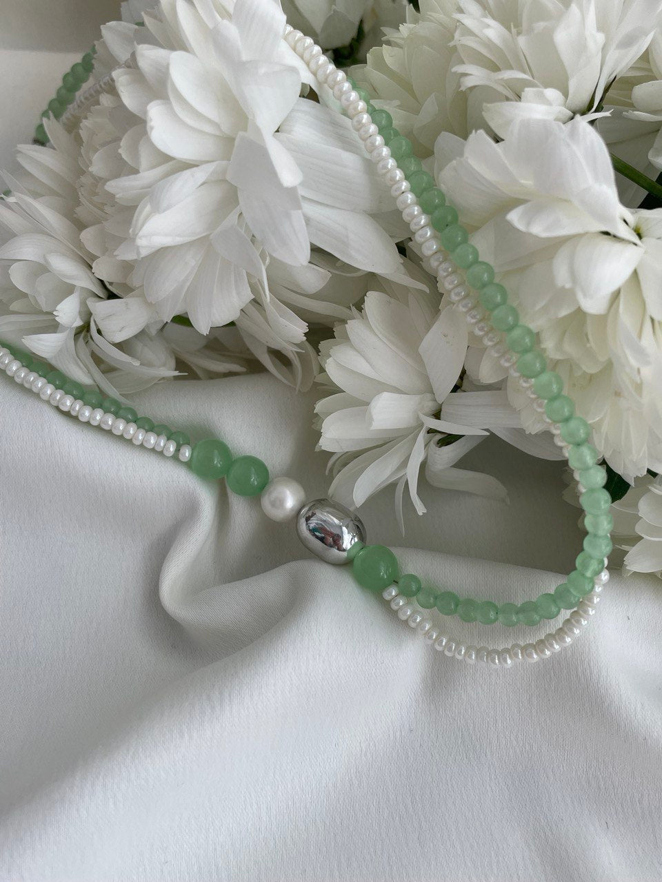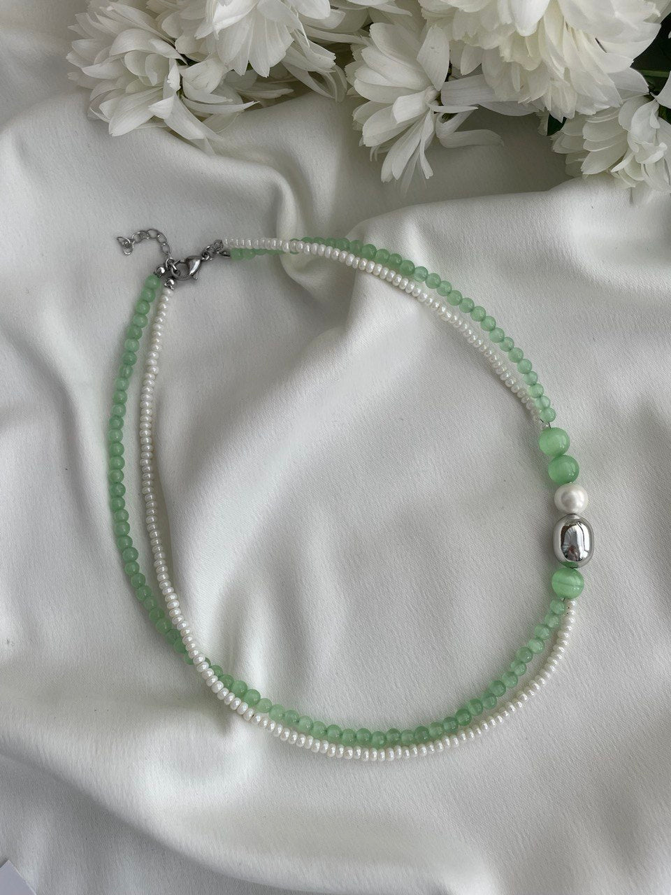 Колье двухрядное из жемчуга Майорка и "кошачьего глаза". Асимметричное расположение металлической бусины. Ручная работа.