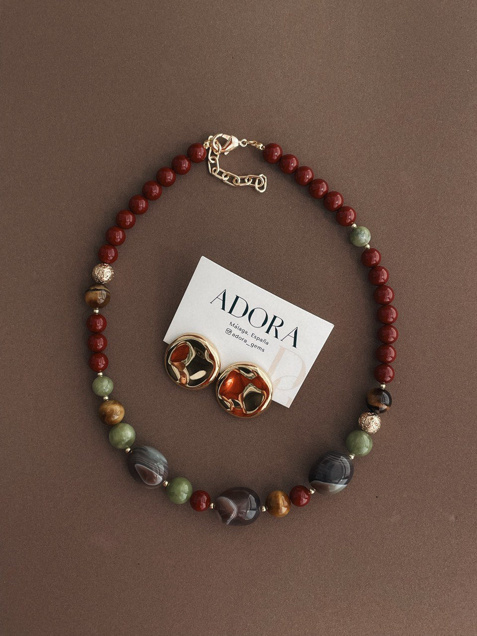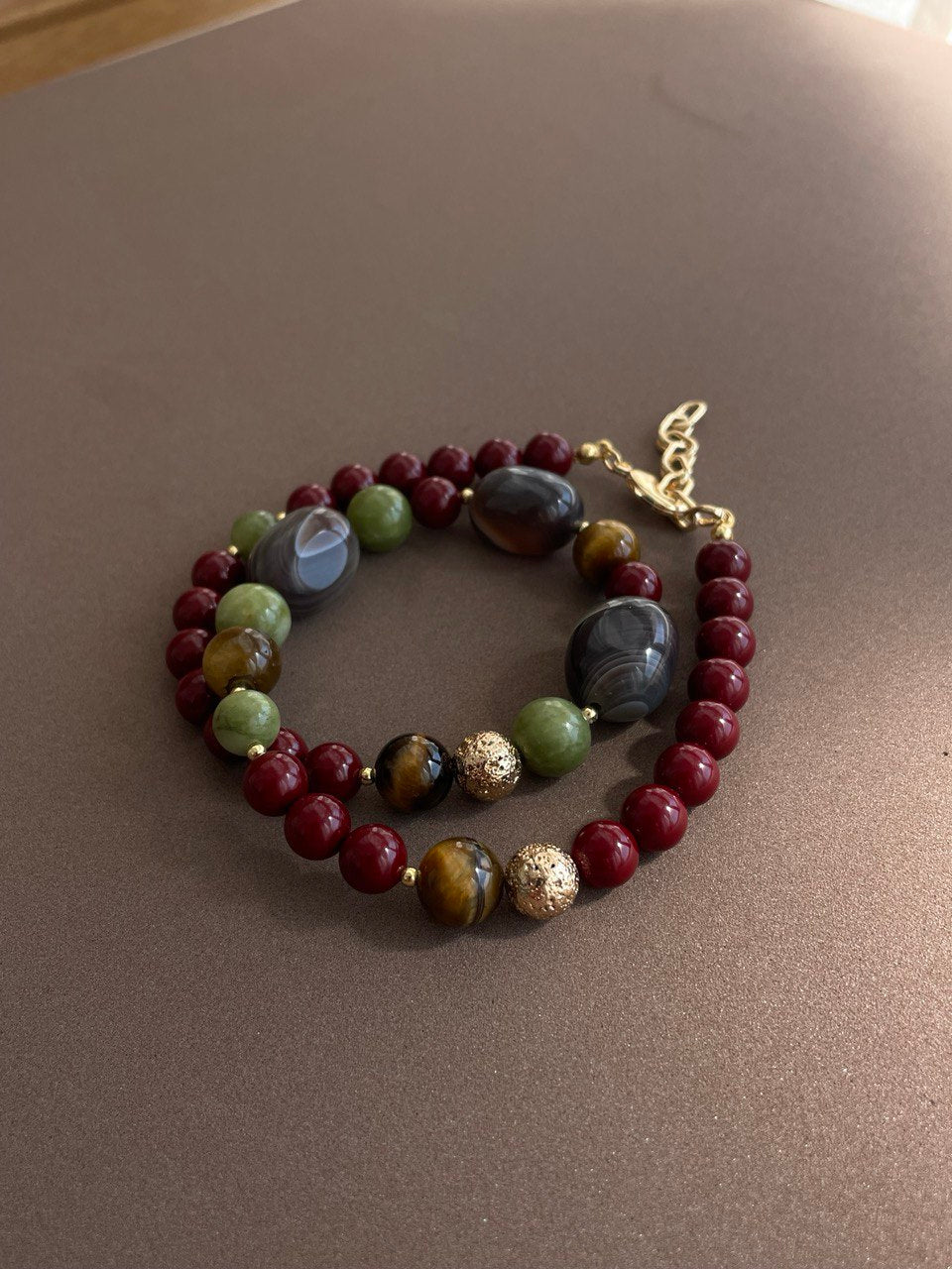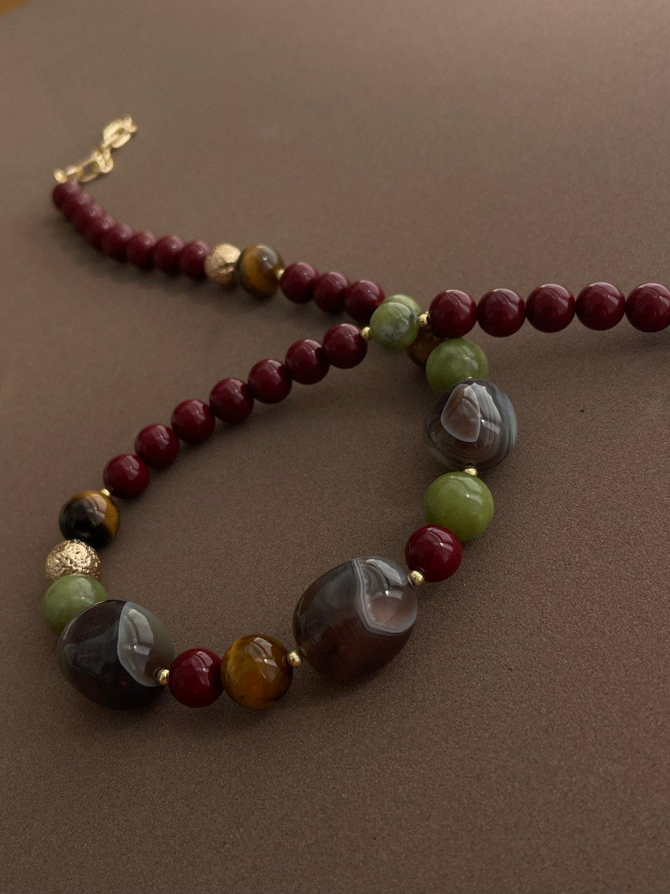 Колье из микса минералов: агата, тигрового глаза, лавы, жадеита и хрустального жемчуга в бордовом цвете.