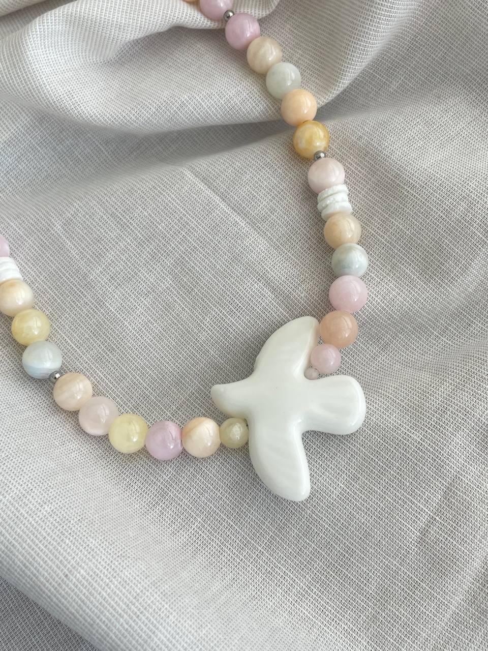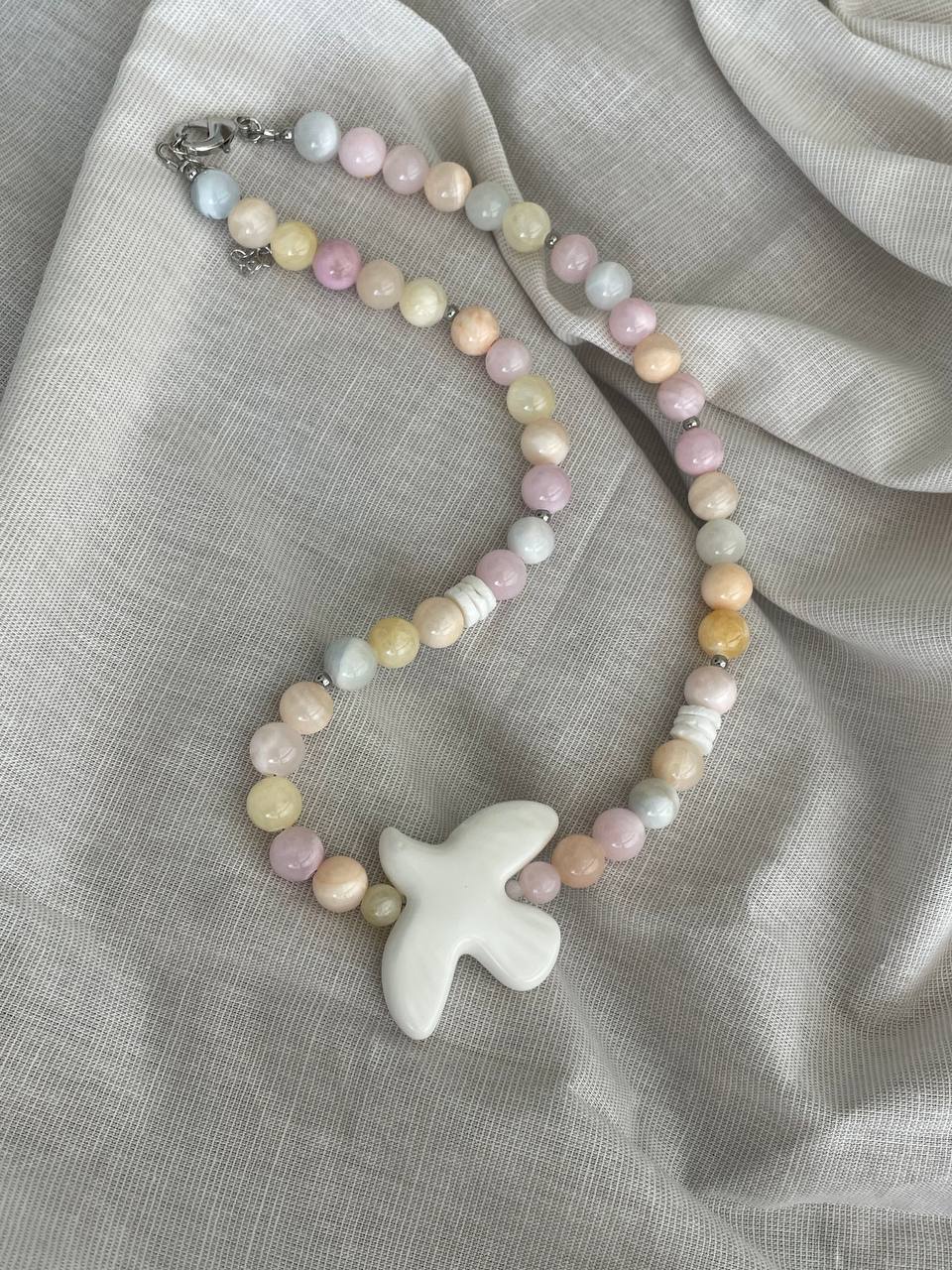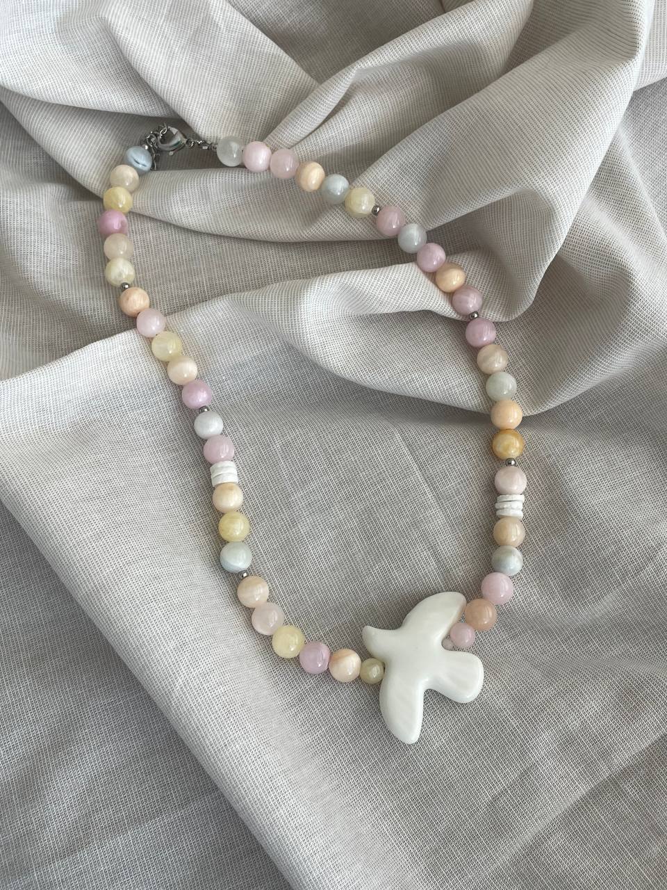 Колье из кварца невероятно нежного оттенка. В центре бусина из керамики в форме птицы. Ручная работа.