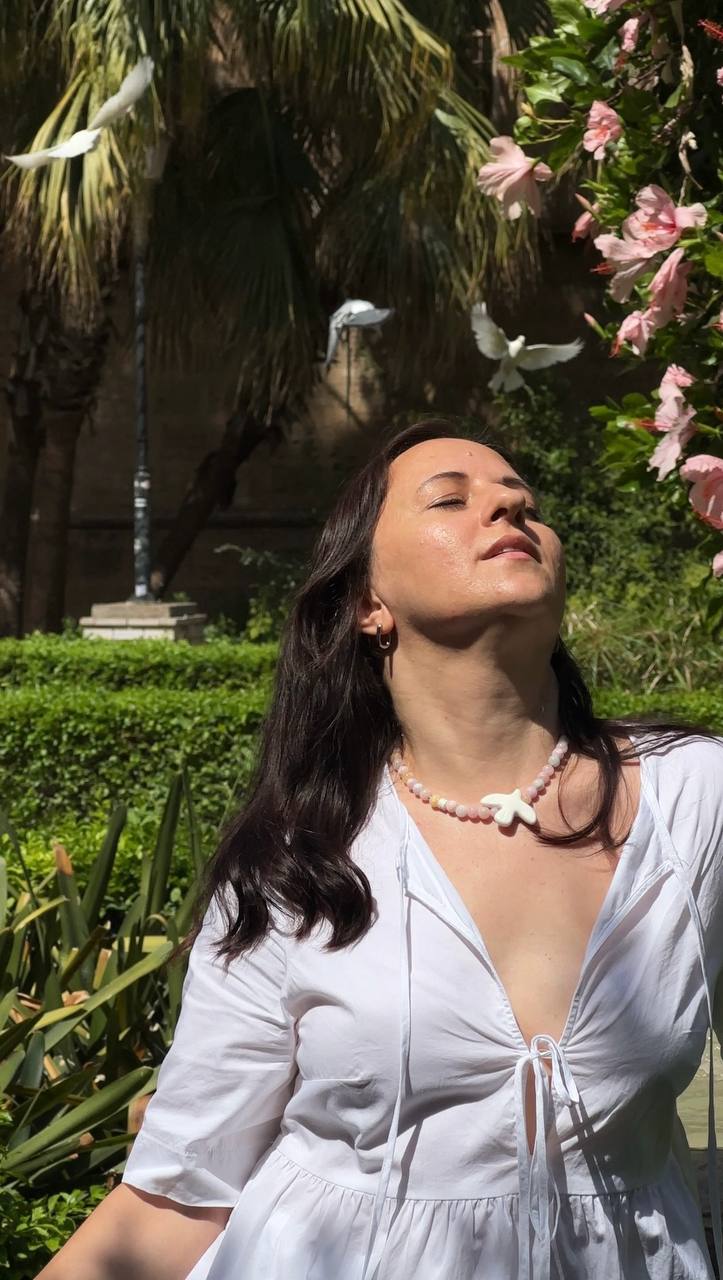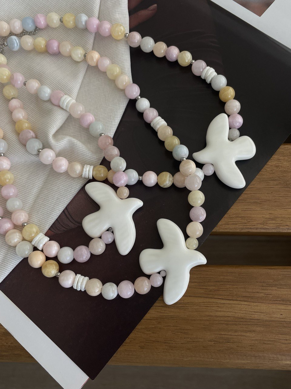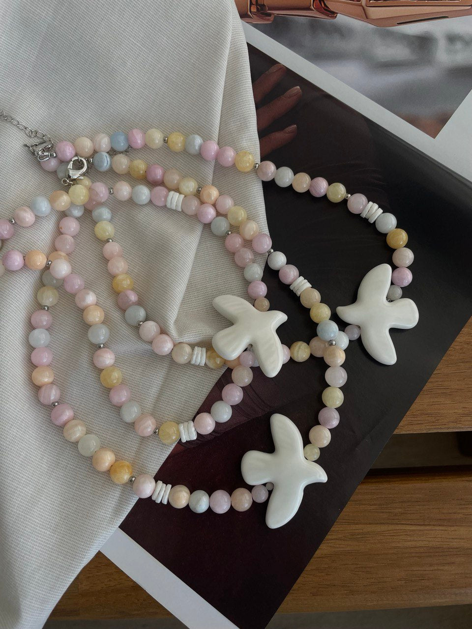 Колье из кварца невероятно нежного оттенка. В центре бусина из керамики в форме птицы. Ручная работа.