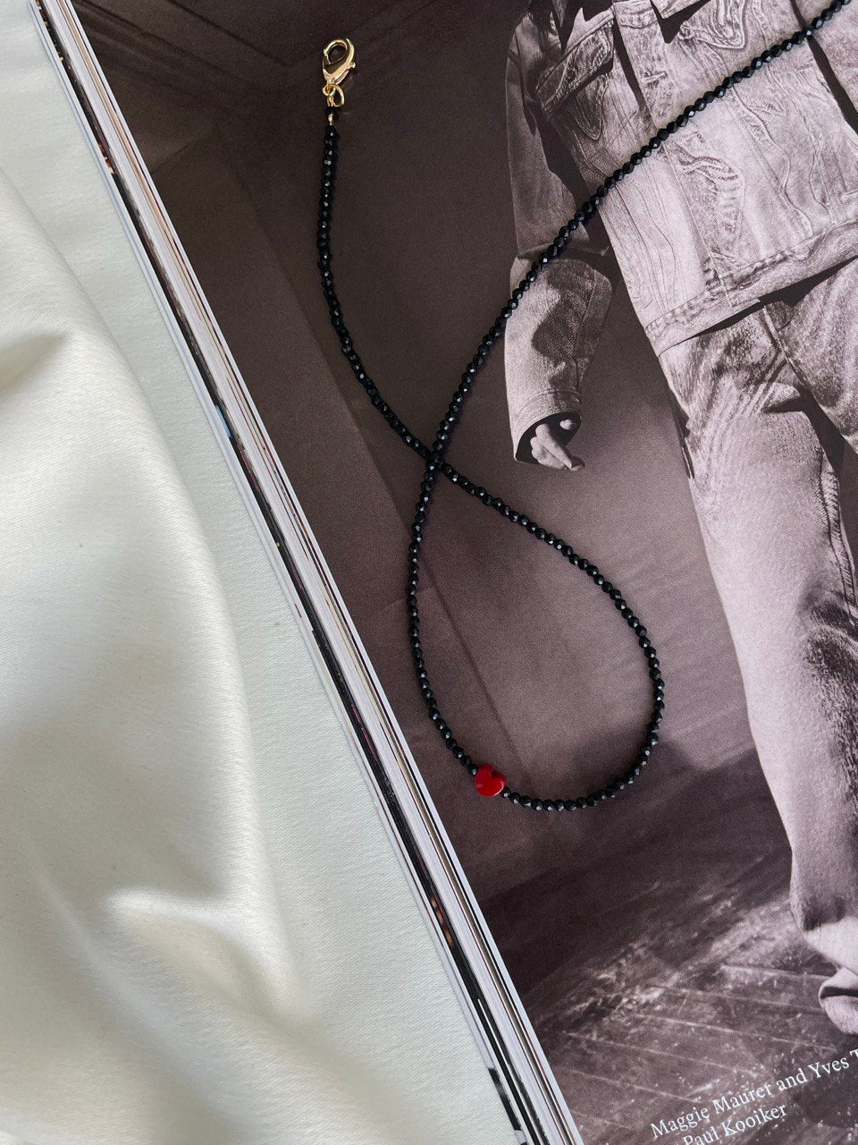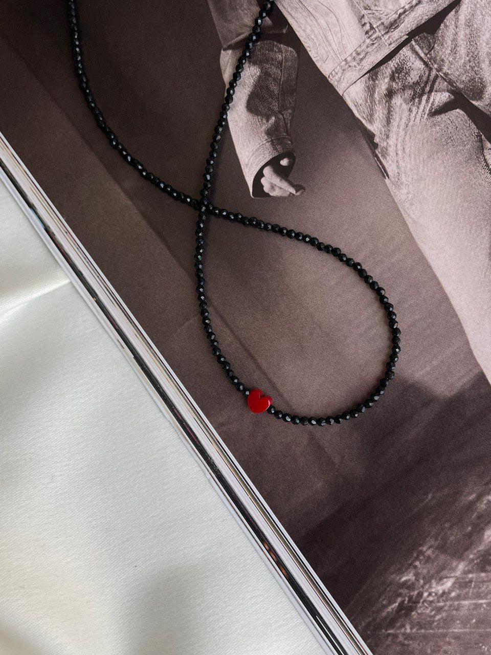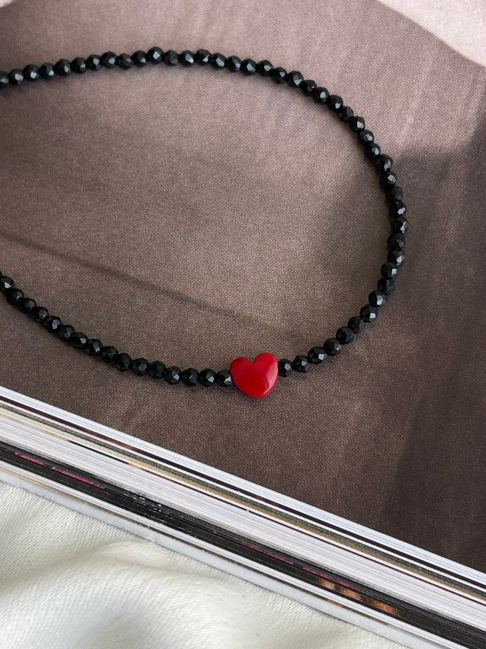 Колье из черной шпинели с бусиной в виде красного сердца.