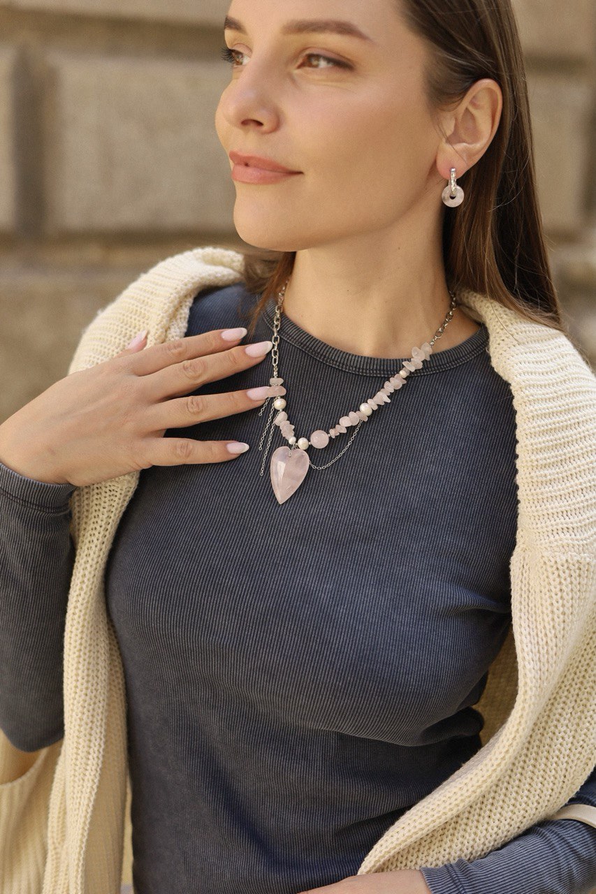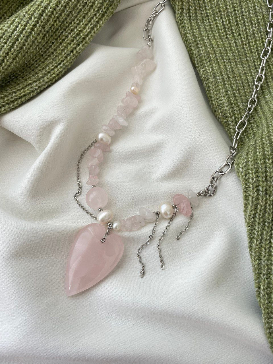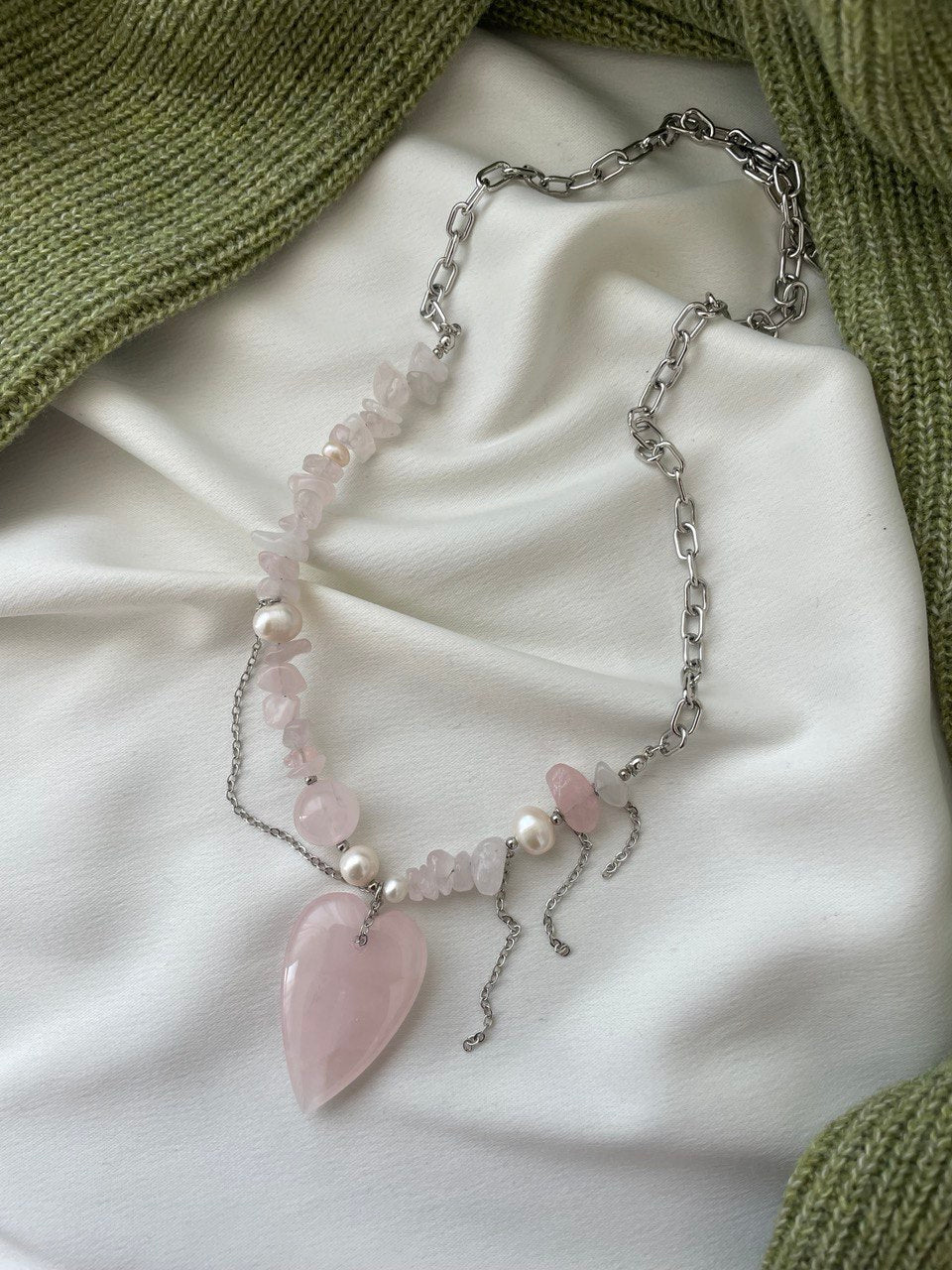 Нежное колье из розового кварца с натуральным жемчугом. Имеет асимметричную форму и подвеску в виде сердца из розового кварца. Ручная работа.