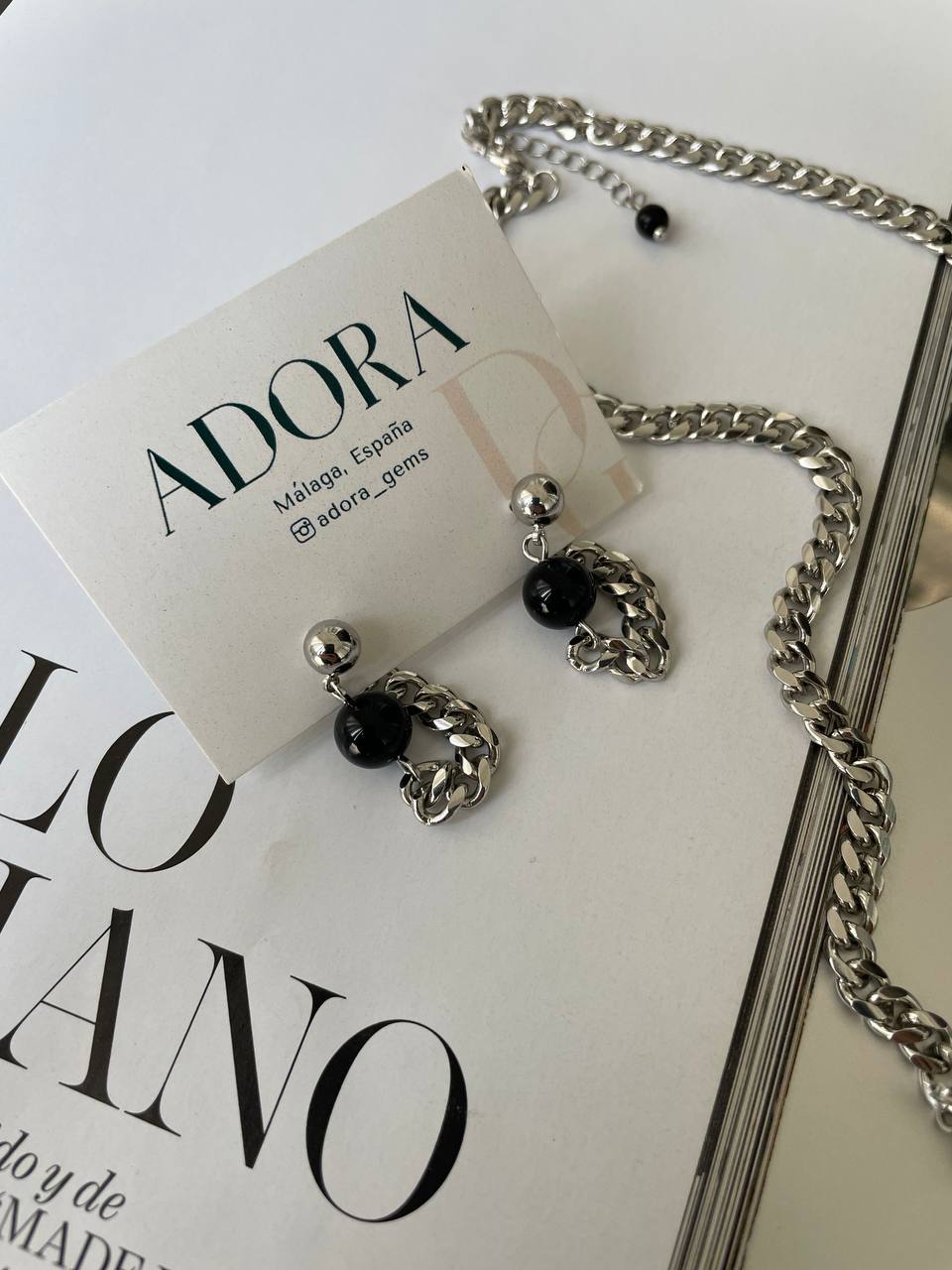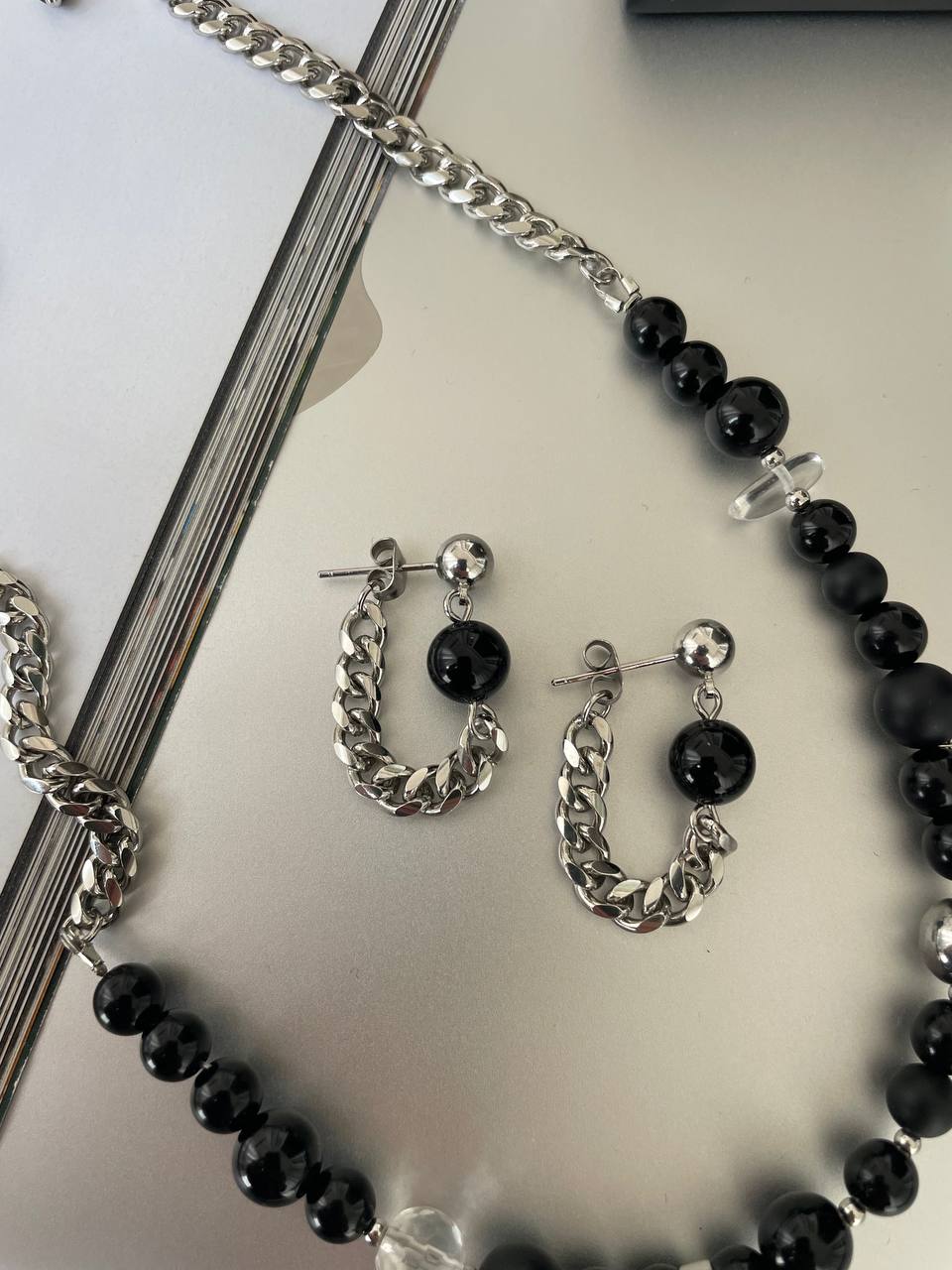 Серьги с черным обсидианом и цепью. Ручная работа.