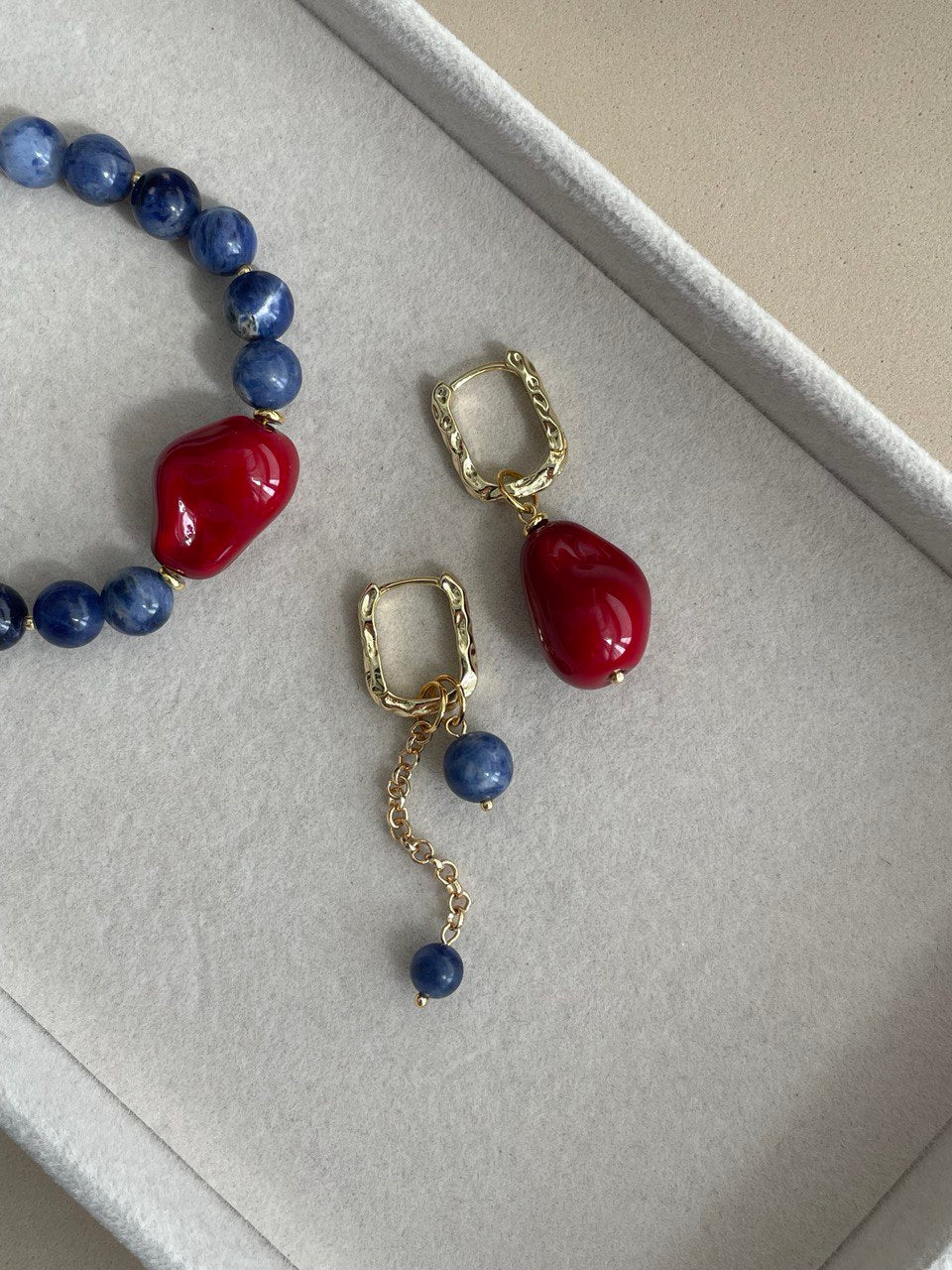 Серьги - овалы с фактурой "мятого металла" со съёмными подвесками из синего содалита и красной жемчужины Майорка. Ручная работа.
