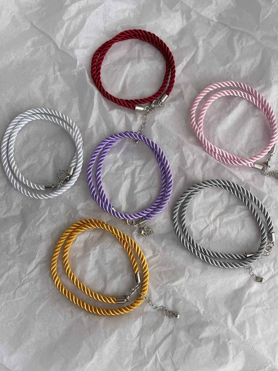 Шнурки на шею в разных цветах. Можно добавлять различные подвески и создавать многослойность с другими украшениями.